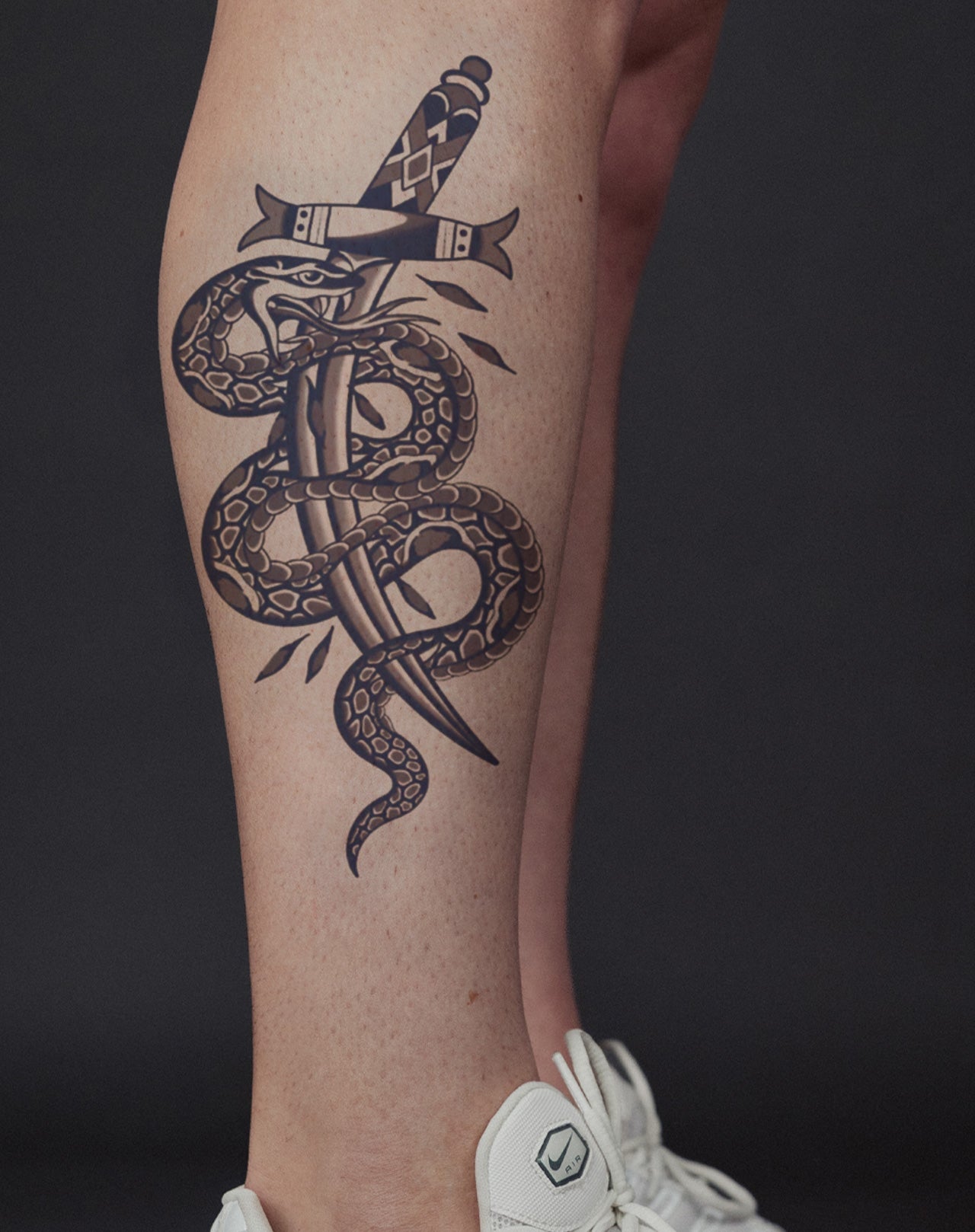 Experience the edgy and rebellious energy of Backstabber! This unique 5.5x9 semi permanent tattoo showcases a stunning design of a snake wrapped around a dagger, expertly created by talented artist Wes. Make a bold and lasting statement with this one-of-a-kind piece of body art.