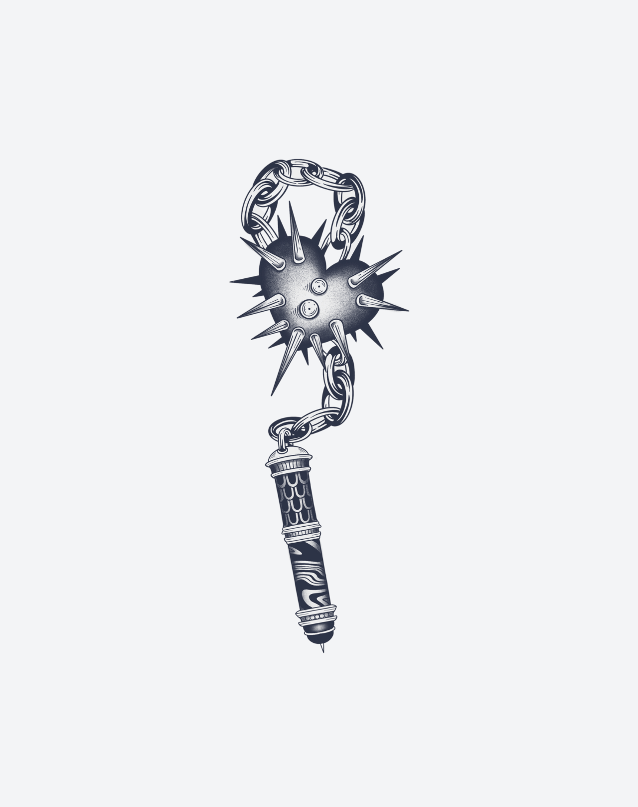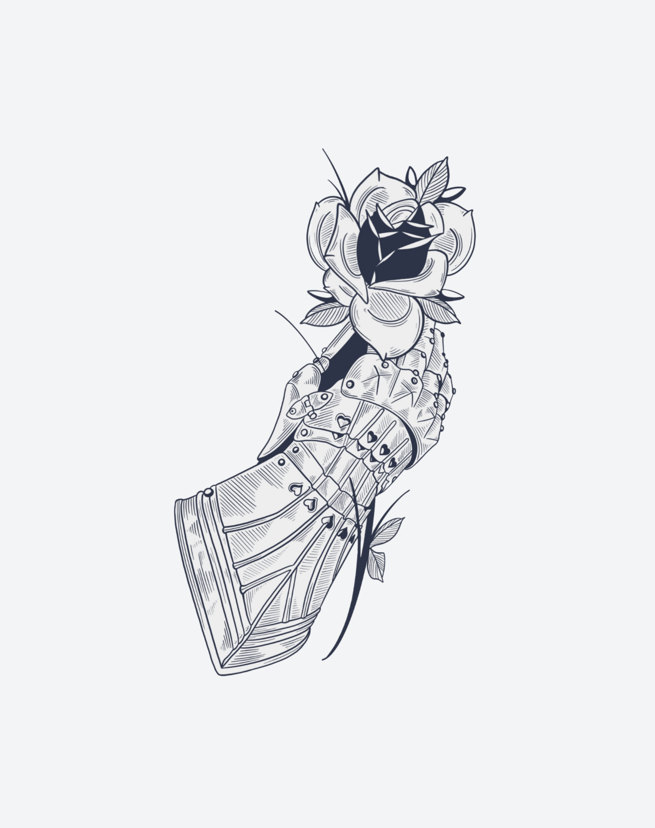 The Beauty in Pain EZINK temporary tattoo pack, featuring three designs created by @yur.da.sells.blackwork, showcases an Oni, a flail, and a knight’s glove holding a rose. Each tattoo lasts 1-2 weeks, offering a striking blend of strength and vulnerability for those who embrace bold, detailed art.