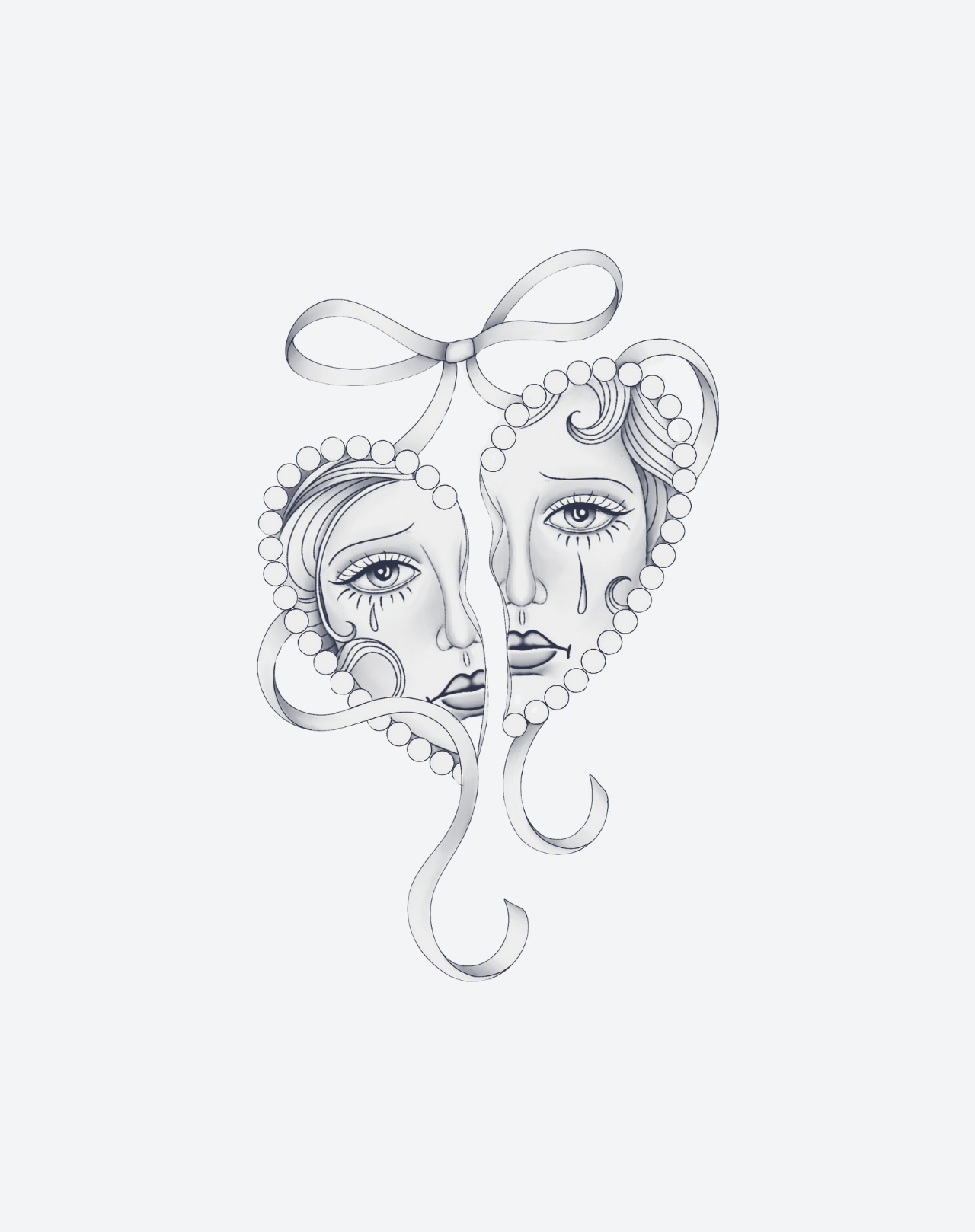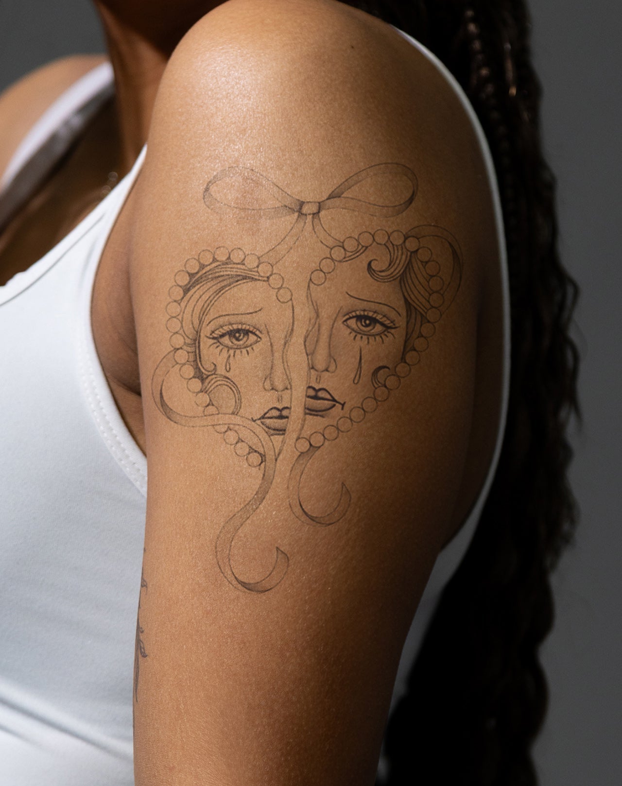Brokenhearted is a 4x7 inch design by @lorrainy.tatts, portraying two sorrowful faces framed within a beaded heart tied delicately with a bow. A crack runs down the center, symbolizing love split in two, the fragility of connection, and the bittersweet beauty of heartbreak. With its blend of softness and melancholy, this piece resonates as both tender and haunting. This 1–2 week EZINK temporary tattoo is perfectly suited for the upper arm, chest, or back of the shoulder.