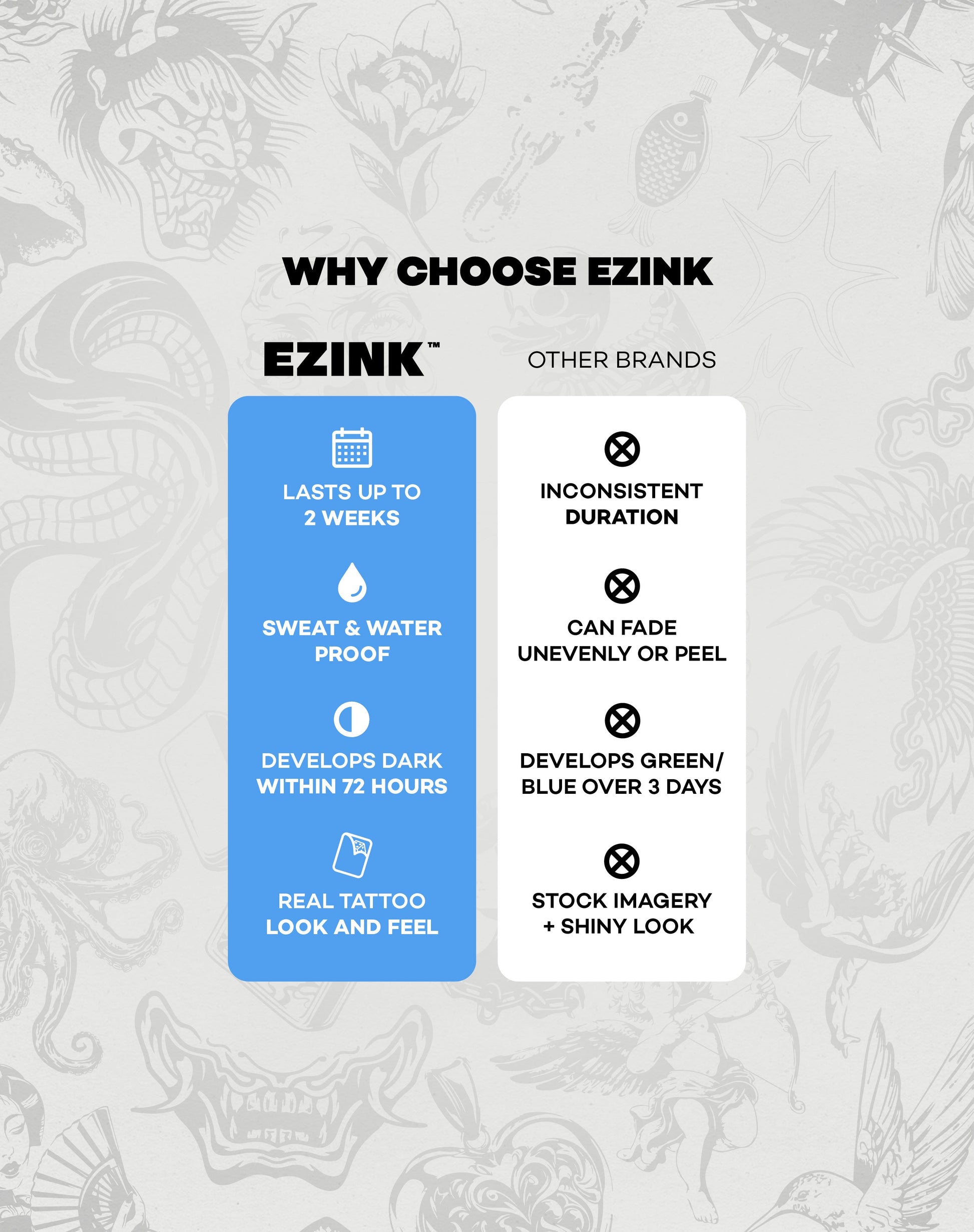 An EZINK tattoo is an ultra-realistic temporary tattoo that lasts 1-2 weeks!