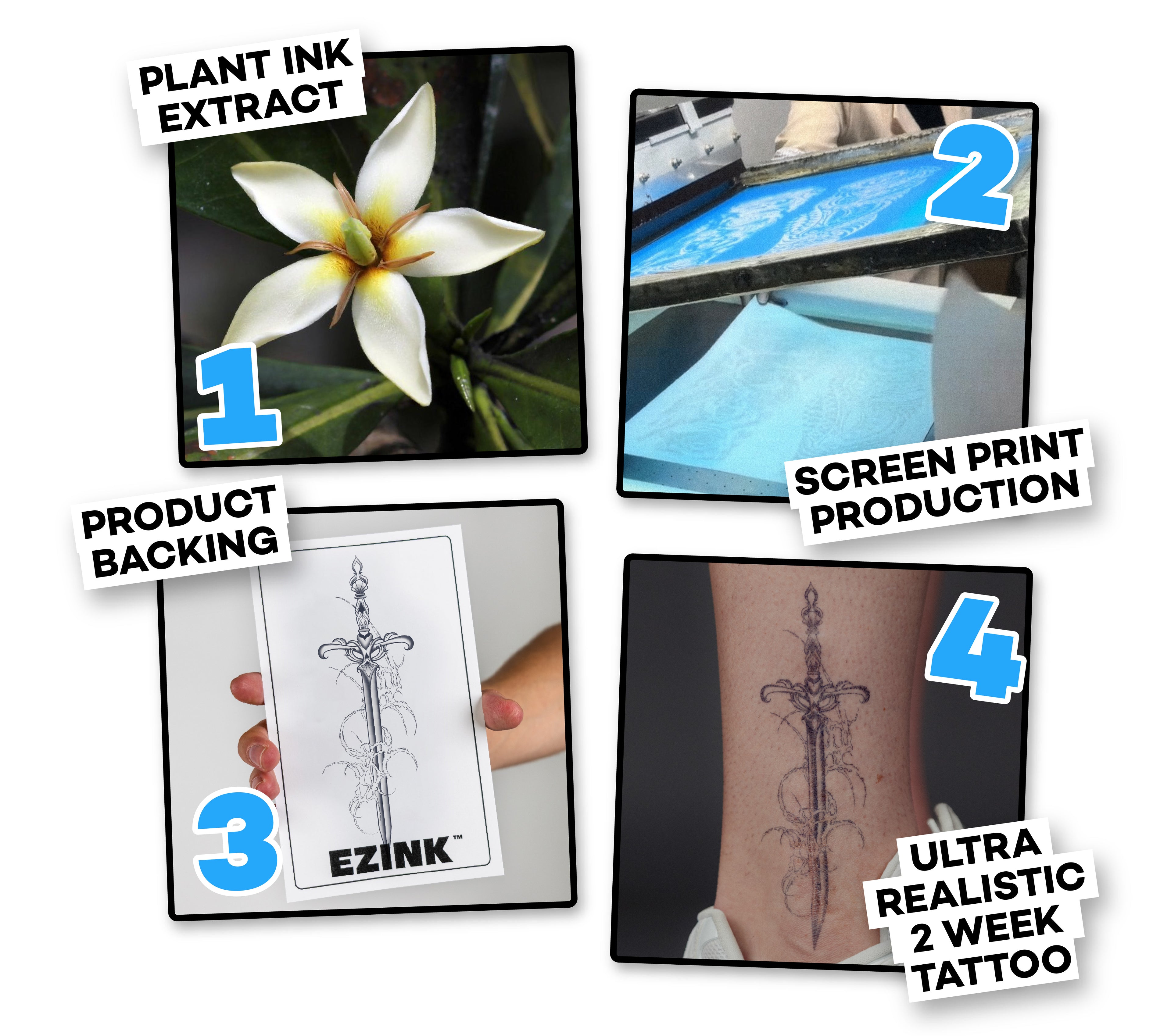 We extract ink from the genipa flower, then print each design onto fine screens where the ink is carefully transferred onto our custom paper backing. This process ensures every tattoo is consistent, detailed, and ready for application. When applied, the tattoo is absorbed into the first layer of your skin and gradually darkens over 24-48 hours, developing into an ultra-realistic tattoo that lasts 1-2 weeks.