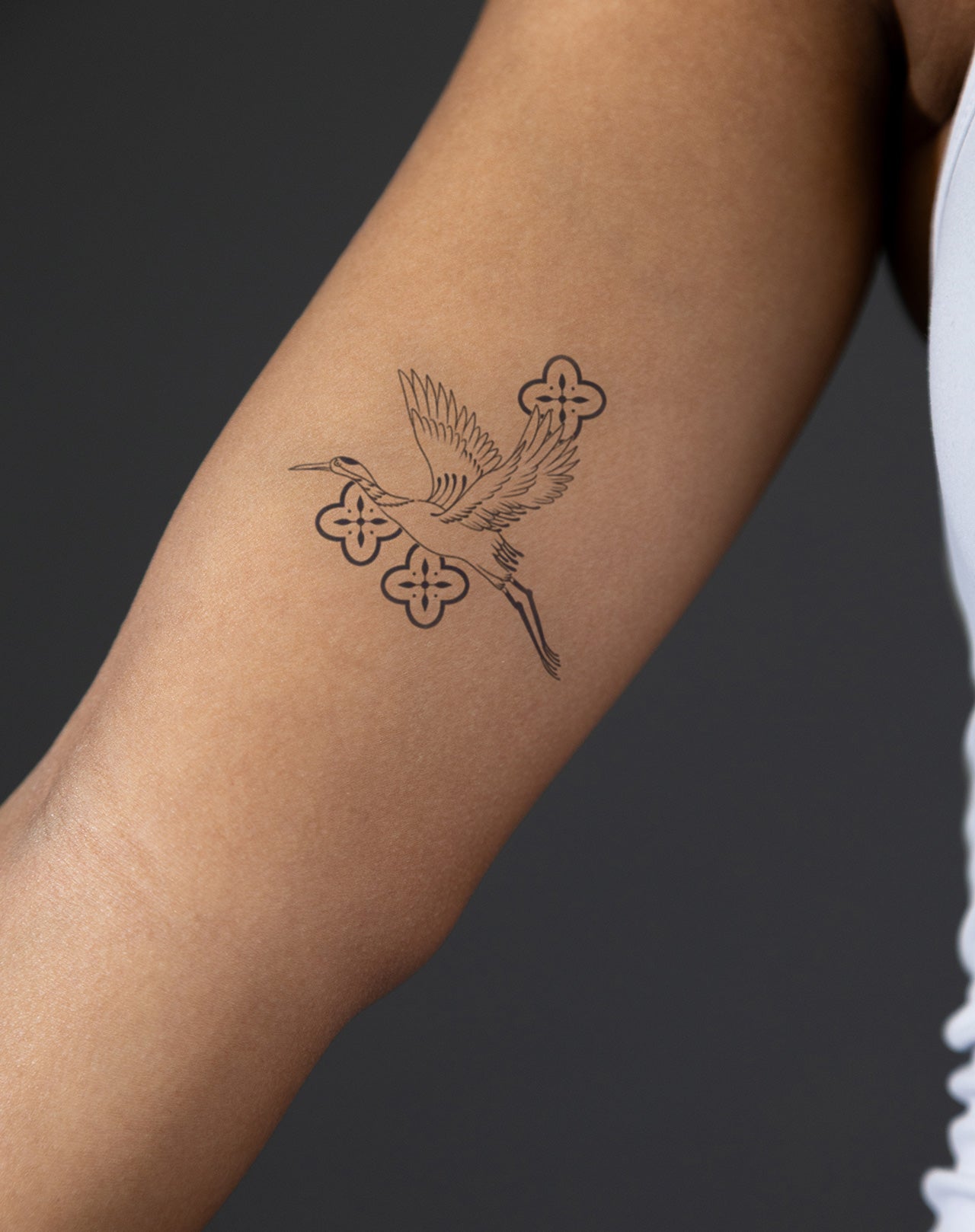 Craned is a 4x4 inch design by @Leenlytat that captures the elegance of a crane mid-flight, surrounded by symmetrical floral motifs. The clean lines and dynamic posture convey freedom, grace, and tradition—ideal for those drawn to symbolic beauty and natural poise. Delivered as a 1–2 week EZINK temporary tattoo.