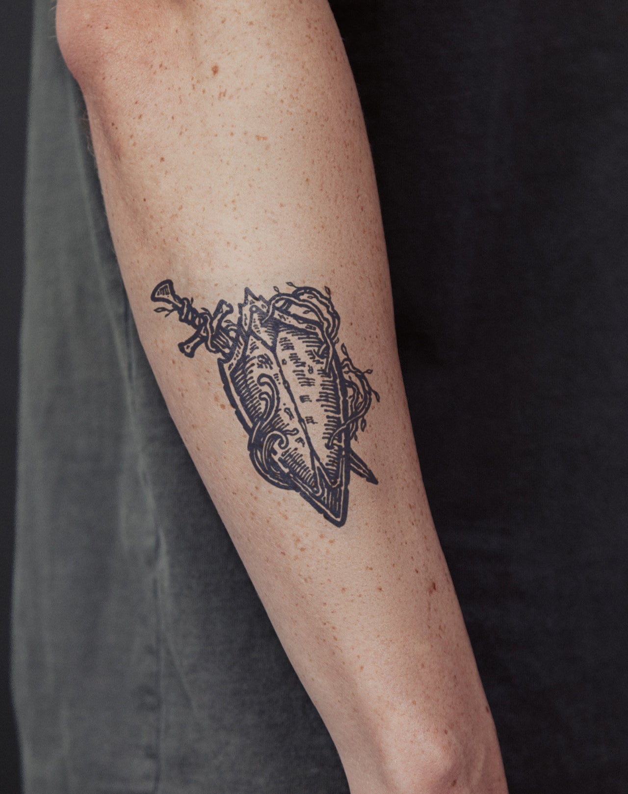 Arm yourself with Defend & Conquer, a 2x4 inch EZINK temporary tattoo by @in.grave.tattoo. Featuring a sword and shield, this design embodies the balance between protection and aggression—strength forged in battle. Lasting 1-2 weeks, it’s for those who know that victory belongs to the bold.