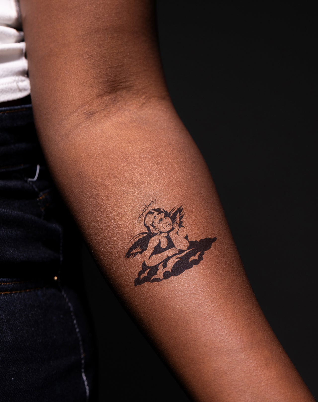 Carry a symbol of innocence and sacrifice with the Divine Pain temporary tattoo, a 4x4 inch design by @loz_tattooer. Featuring a cherub resting on a cloud beneath a thorned halo, this piece embodies the balance between divinity and suffering. Lasting 1-2 weeks, it’s a fleeting yet powerful mark of beauty and resilience.