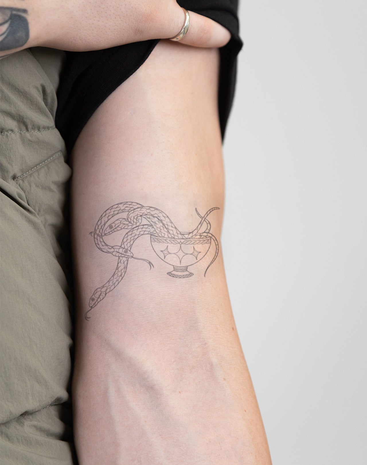 Divine Poison is a 4x4 inch design by @lish.tattoos, weaving elegance and danger into a single, hypnotic form. A serpent curls around a chalice, its poised body and precise scales evoking both temptation and transformation. The fine linework balances restraint with intensity—each curve a quiet echo of ancient symbolism. Long regarded as an emblem of healing, wisdom, and forbidden knowledge, the serpent here becomes a vessel of paradox: life and death, venom and cure. This 1–2 week EZINK temporary tattoo’s fluid symmetry makes it ideal for placement along the forearm, sternum, or spine—reminding the wearer that what can wound can also awaken.