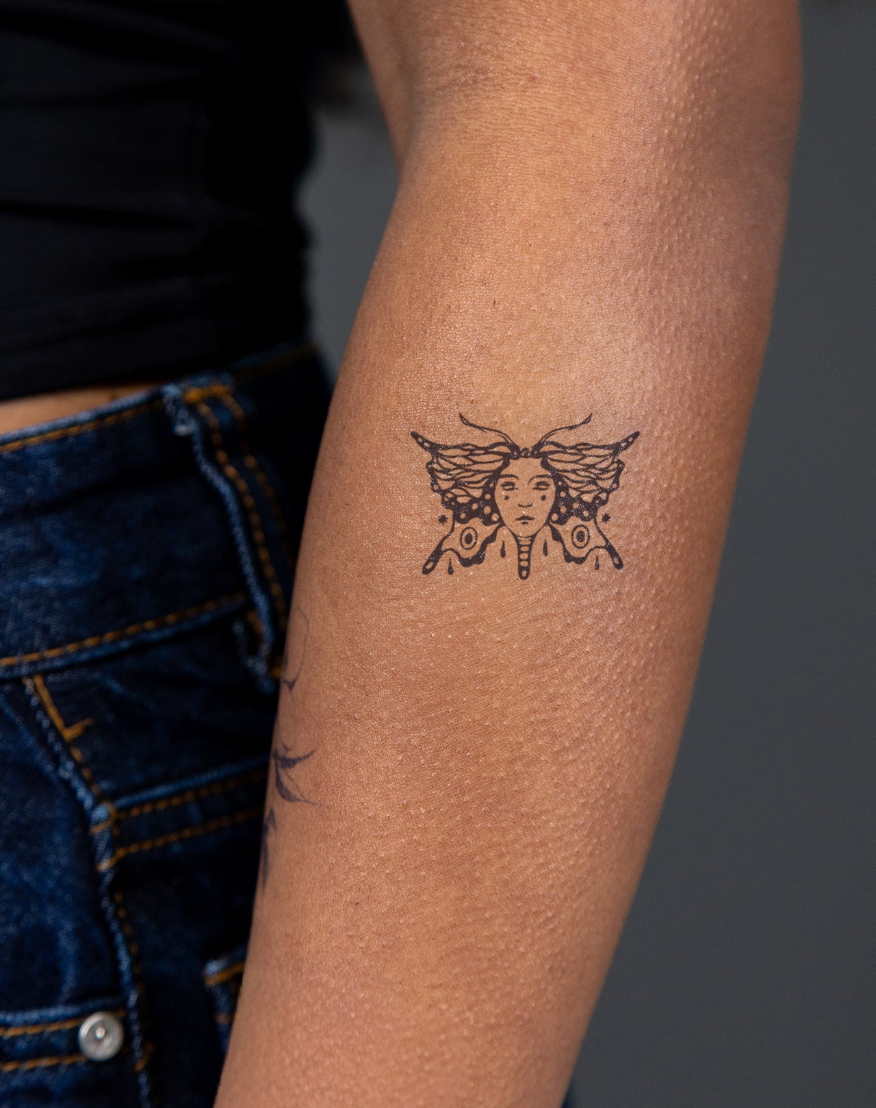 Disappear into transformation with Fading Identity, a 2x2 inch EZINK temporary tattoo by @mambo_tattoos. Featuring a butterfly with a woman’s face at its core, this design embodies the tension between change and self-discovery. Lasting 1-2 weeks, it’s perfect for those who embrace the blurred line between who they are and who they’re becoming.