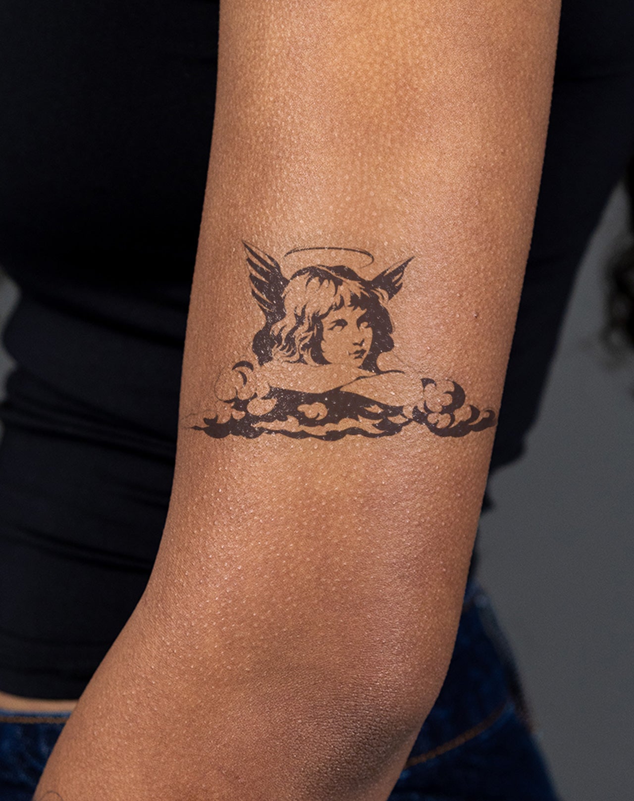 Embrace the serenity of the unseen with the Fallen Gaze temporary tattoo, a 4x4 inch design by @loz_tattooer. Featuring a cherub resting on a cloud with a solemn halo, this piece captures the essence of quiet contemplation and celestial mystery. Lasting 1-2 weeks, it’s a fleeting yet timeless mark of grace.