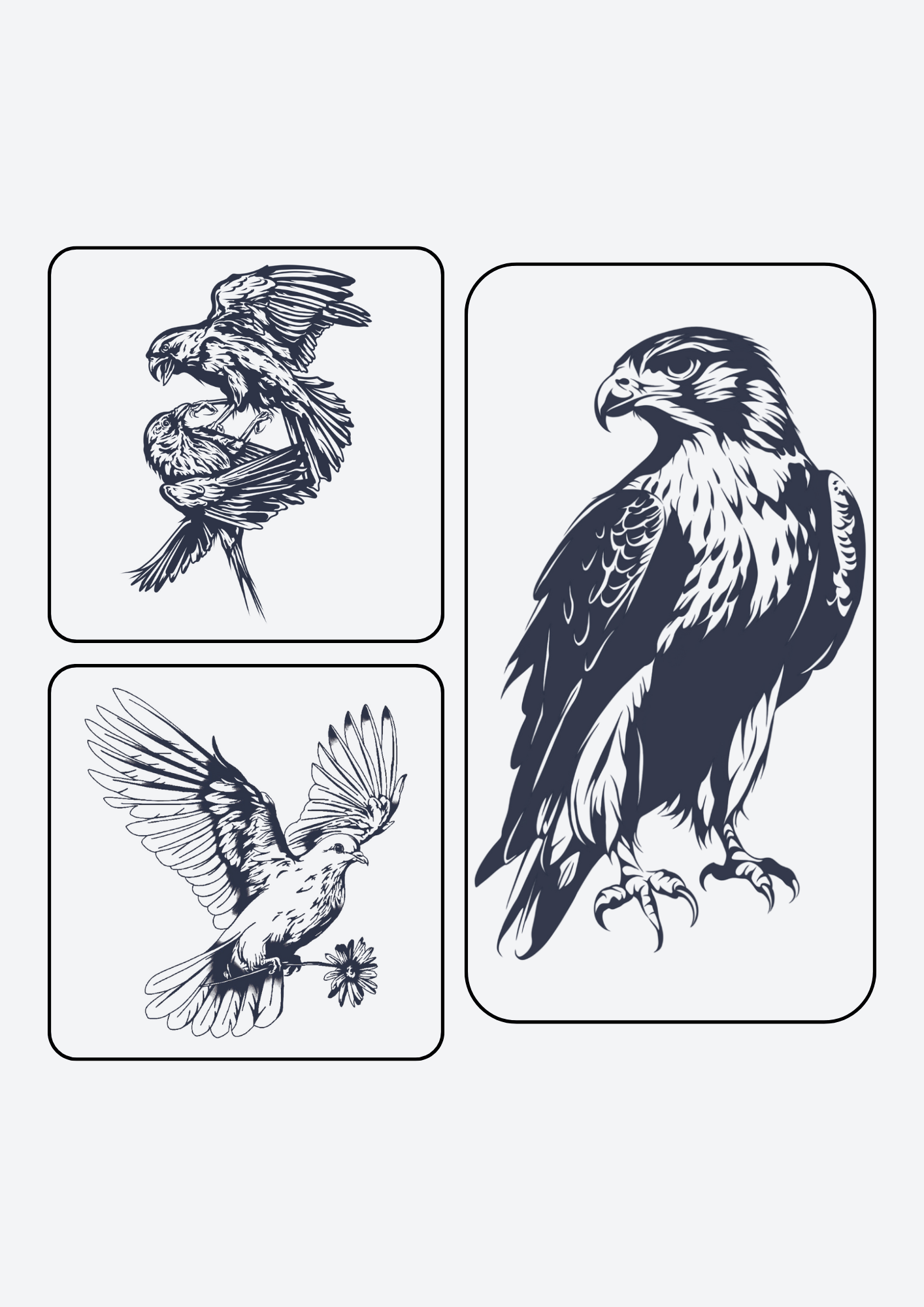Flock Pack is a three-piece set celebrating avian power, grace, and conflict through bold blackwork. It includes a 4x7 inch eagle in mid-swoop, a 4x4 inch dove delicately holding a flower, and a 4x4 inch depiction of two birds locked in fierce flight. Created by featured EZINK artists, these temporary tattoos last 1–2 weeks, perfect for those who soar, seek peace, or aren't afraid to fight for their skies.
