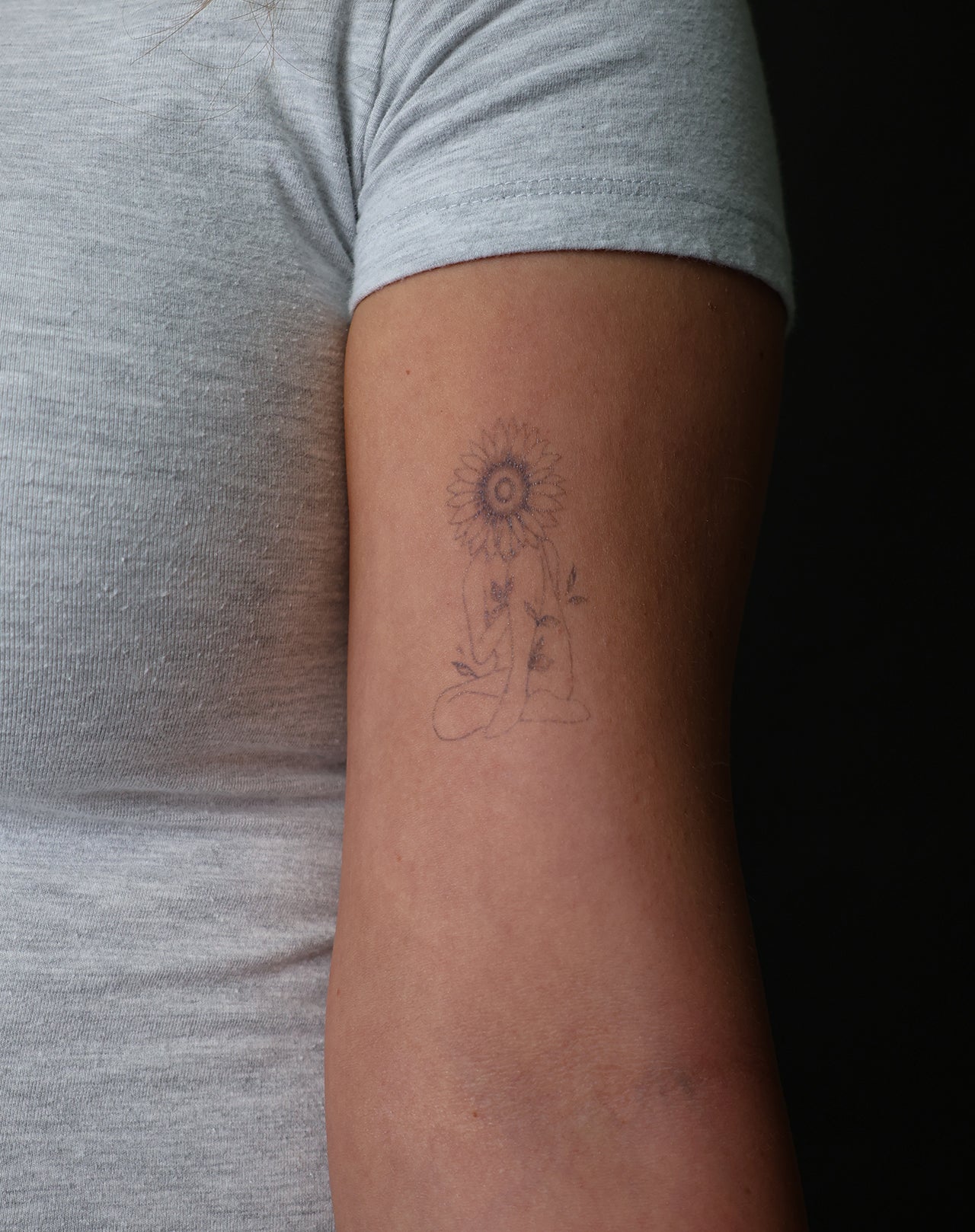 Flora Femme is a 2x3 inch design by @brooketattoos, depicting a seated feminine form whose head blossoms into a radiant sunflower. Delicate leaves sprout along the body, blurring the line between human and nature. This 1–2 week EZINK temporary tattoo symbolizes growth, vitality, and self-renewal — a celebration of becoming and the beauty in transformation.