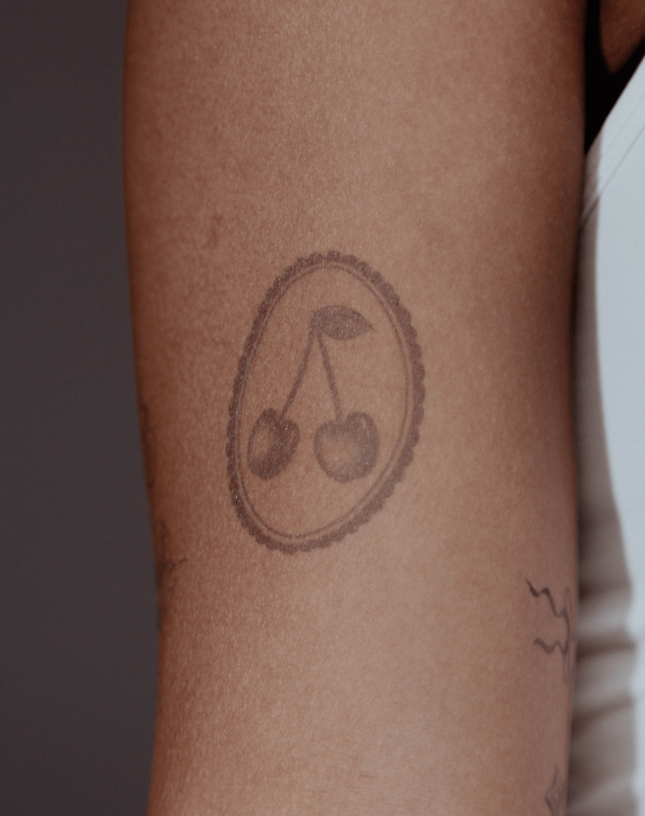 Framed Cherry is a 2x3 inch design by @Leenlytat that blends playful charm with timeless elegance. Two softly shaded cherries hang in balance, cradled by a vintage-style scalloped frame. The bold black outline contrasts with the soft gradients of the fruit, evoking feelings of sweetness, nostalgia, and feminine flair. Ideal for those who celebrate whimsy and classic motifs. Delivered as a 1–2 week EZINK temporary tattoo.