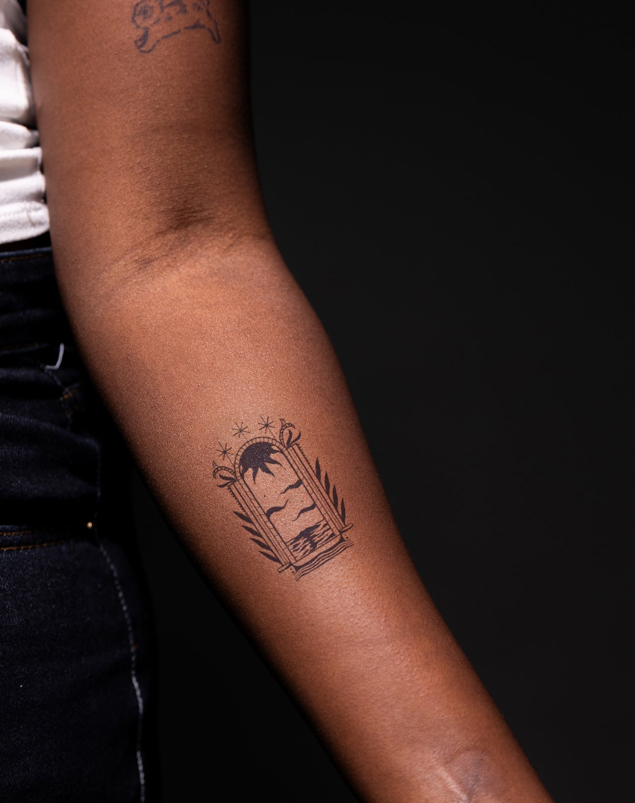 Step through the unknown with Gateway to Paradise, a 2x3 inch EZINK temporary tattoo by @mambo_tattoos. Featuring a doorway leading to a paradise unknown, this design symbolizes escape, freedom, and the pursuit of something greater. Lasting 1-2 weeks, it’s for those daring enough to walk through the doors of possibility and beyond.