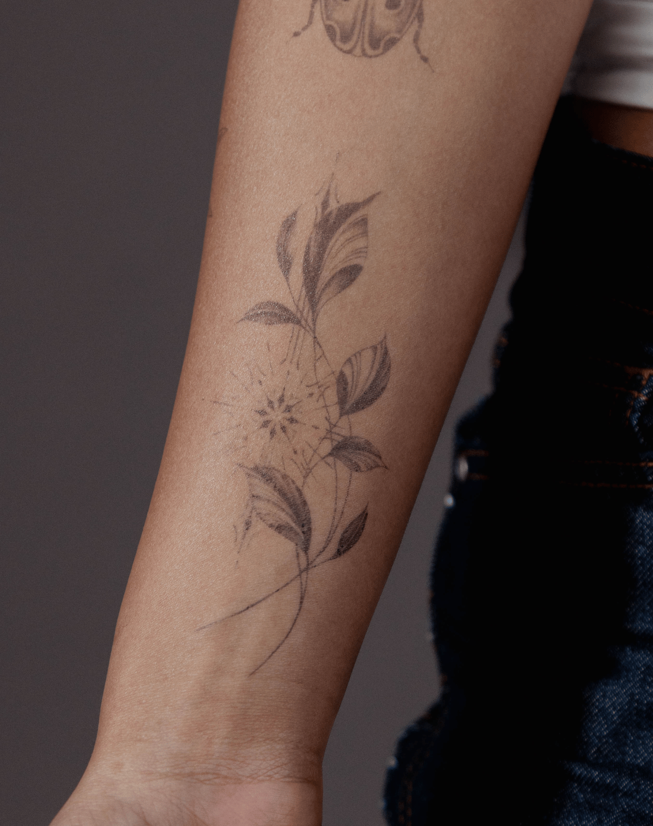 Jardin De Bloom is an ethereal 3x6 inch design intertwining fine-lined foliage with radiant ornamental stars, forming a floral constellation of elegance. Created by @_buffaaaa_, this EZINK temporary tattoo lasts 1–2 weeks, perfect for those who flourish in stillness and find magic blooming in every detail.