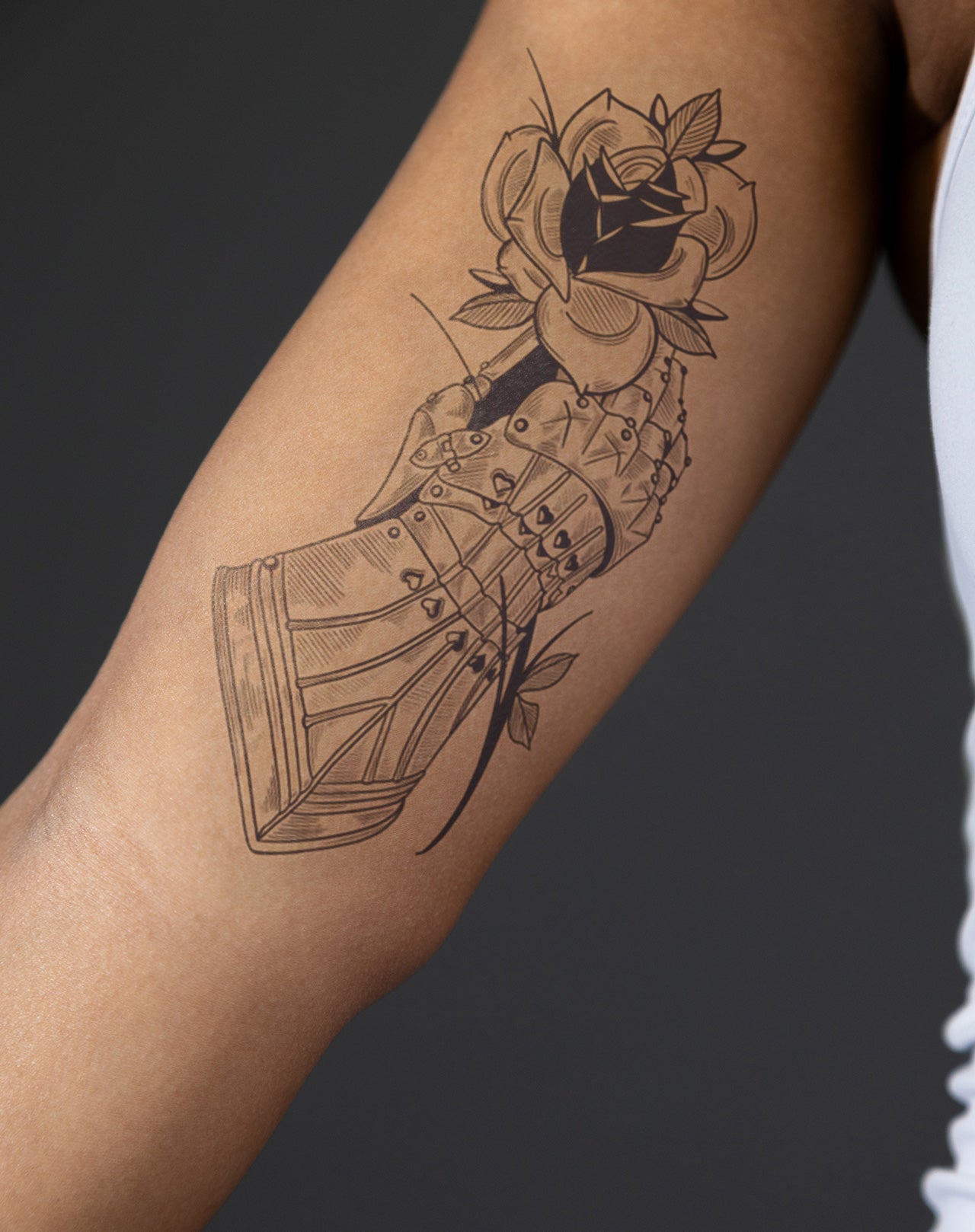 Honor the balance of strength and devotion with the Knight’s Love temporary tattoo, a 4x7 inch design by @yur.da.sells.blackwork. Featuring a detailed knight’s gauntlet clutching delicate roses, this piece symbolizes the duality of war and romance, power and vulnerability. Lasting 1-2 weeks, it’s a striking emblem of loyalty and passion.