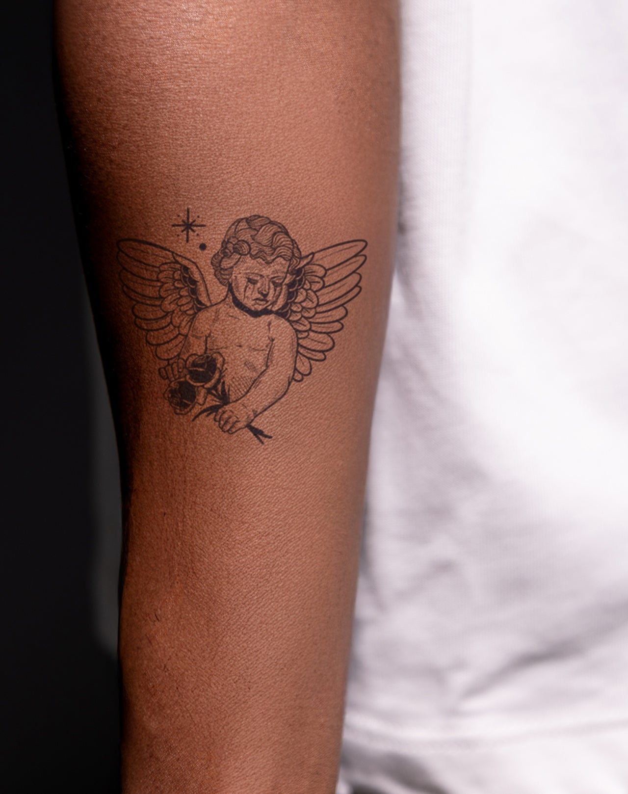 Embrace divine romance with the Loving Cherub tattoo, a 4x4 inch design by @yur.da.sells.blackwork. Featuring a delicately detailed cherub cradling roses, this piece symbolizes love, innocence, and devotion. A perfect blend of classic and bold blackwork, this tattoo lasts 1-2 weeks—letting you carry a touch of celestial beauty wherever you go.