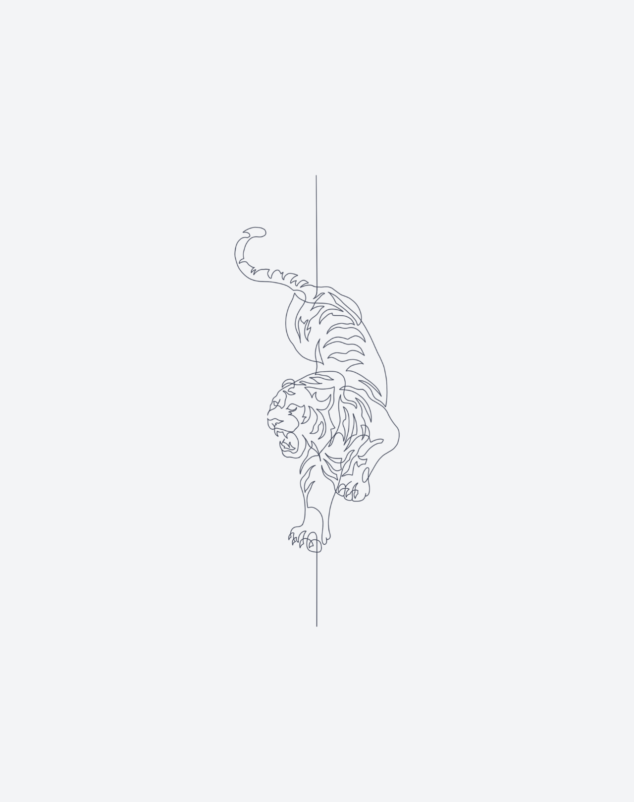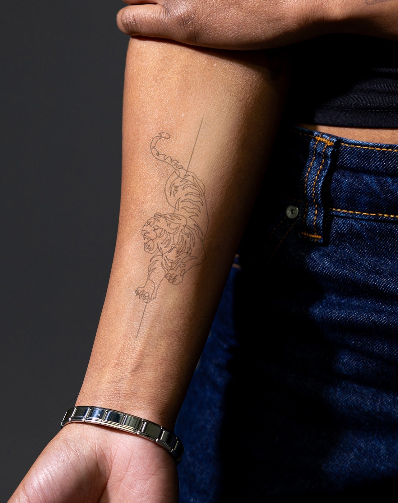 Prowl is a 2x4 inch design by @swinkInk that captures a tiger in mid-stride, emerging with poised aggression from a single vertical line. Created in a continuous-line style, this minimalist rendering conveys movement, tension, and raw power with elegant restraint. A symbol of silent strength and focused intent, this 1–2 week EZINK temporary tattoo is perfect for those who carry calm confidence beneath the surface.