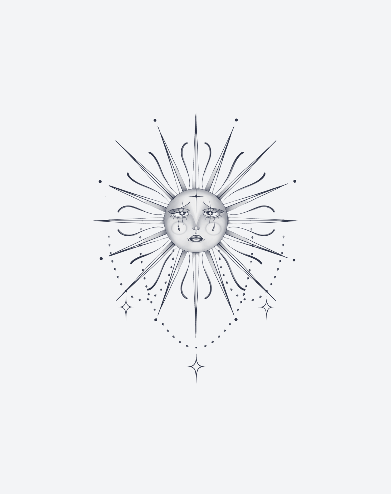 Sol Weeps is a 4x4 inch design by @lorrainy.tatts, portraying a sorrowful sun whose tears fall like starlight. Intricate rays extend outward in a balanced halo, surrounded by delicate dots and celestial accents, blending warmth with melancholy. This striking 1–2 week EZINK temporary tattoo symbolizes endurance through grief, the coexistence of light and loss, and the eternal cycles of renewal.