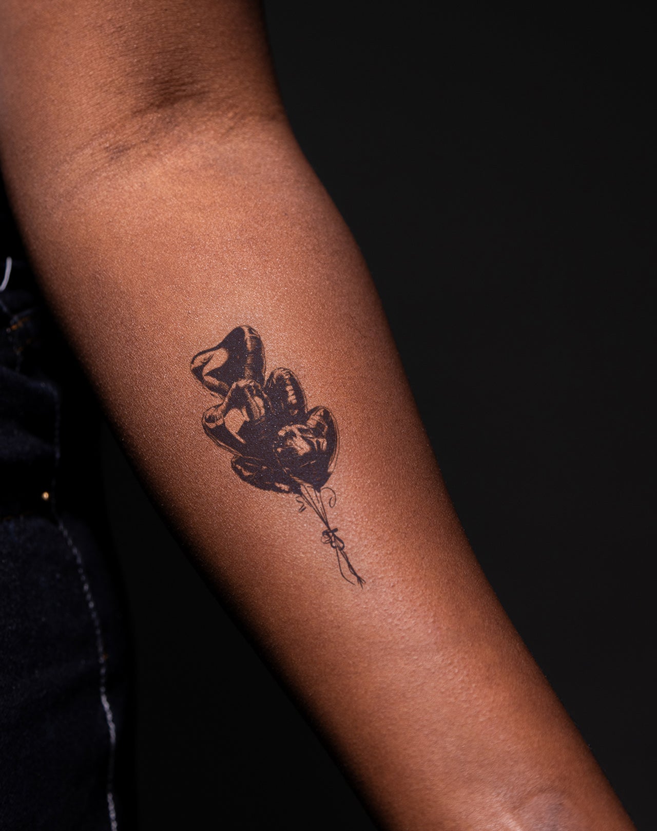 Decorate your Valentine's Day with our 2x4 inch EZINK temporary tattoo, created by 967tattoo! Featuring a design of black and chrome balloons in the shape of love hearts, this tattoo lasts 1-2 weeks, adding a touch of fun and romance to any occasion.