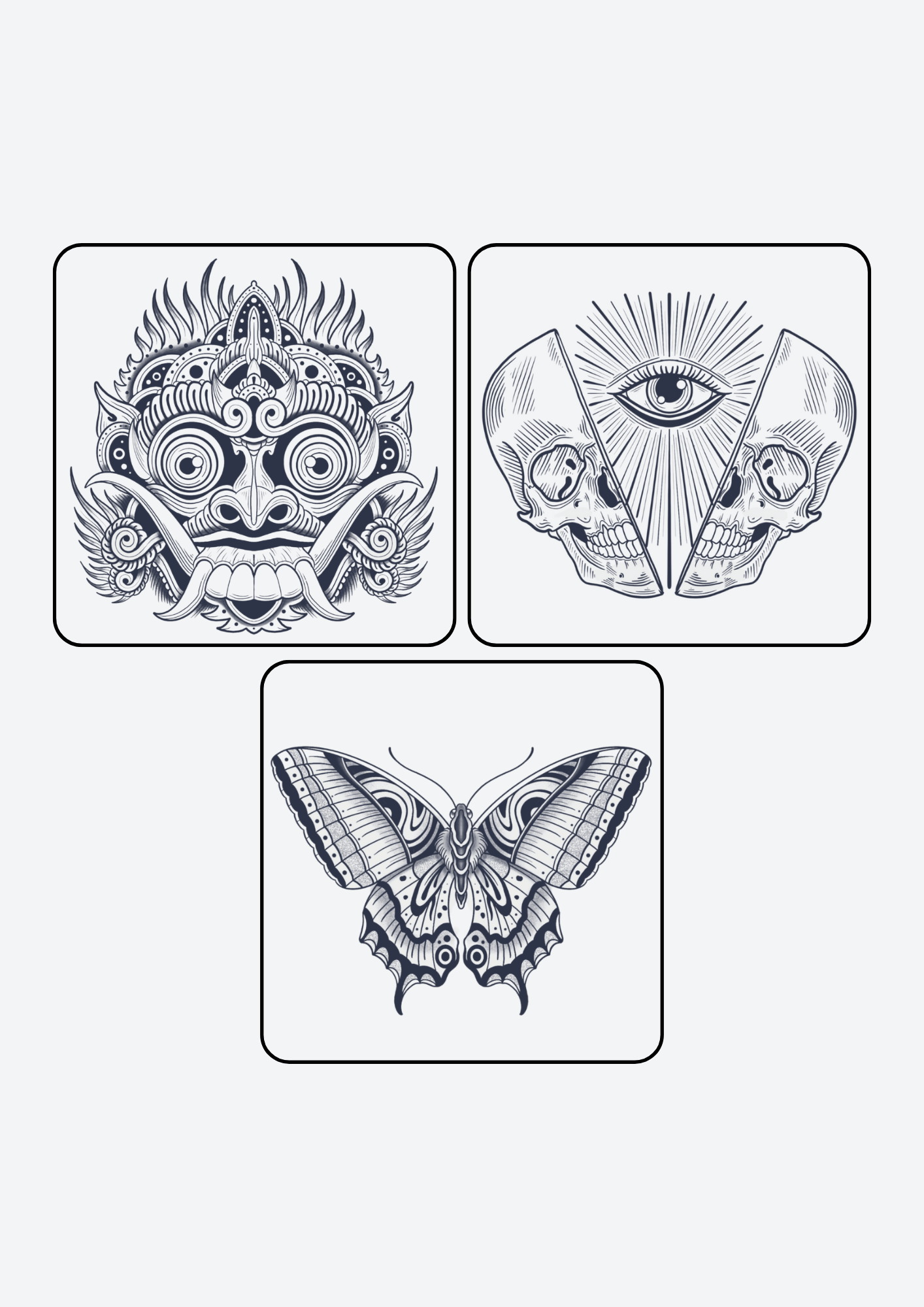 Experience bold and beautiful designs with the Visions & Omens Pack! This EZINK temporary tattoo pack, featuring 3 4x4 designs created by @yur.da.sells.blackwork, lasts 1-2 weeks for long-lasting, stunning body art. Express yourself and make a statement with these unique and eye-catching temporary tattoos.
