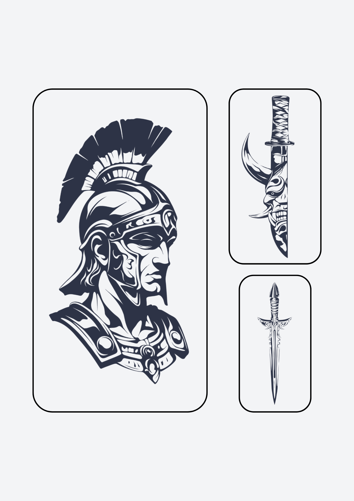 The Warrior Pack EZINK temporary tattoo set, featuring three designs created by @mahlo_tattoo, includes tattoos in 2x4, 3x6, and 4x7 inch sizes. Each piece channels strength and resilience through bold lines and powerful symbolism. This pack lasts 1-2 weeks, perfect for those who wear their warrior spirit on their skin.